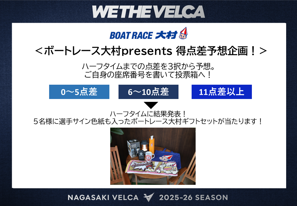 ハーフタイムまでの点差を3択から予想して予想が的中した中から抽選で5名様に選手サイン入り色紙が入ったボートレース大村ギフトセットをプレゼント!