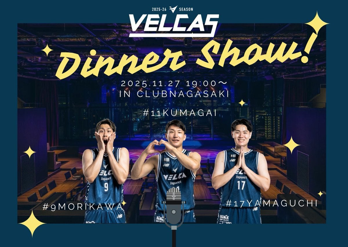 11月27日(木)に長崎ヴェルカファンクラブ「VELCAS」会員限定ディナーショーの開催が決定いたしました。森川正明選手、熊谷航選手、山口颯斗選手の登壇も決定し、ディナーショー限定でスペシャルトークショーやイベントを準備中です。