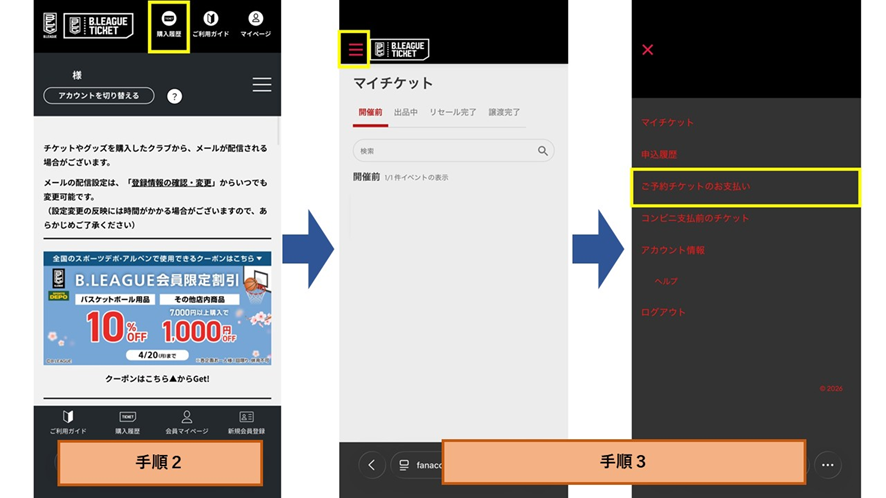 A. B.LEAGUEチケットの「マイページ」内にある「ご予約チケットのお支払い」項目からお手続きいただけます。通常のチケット購入画面(スケジュール一覧)からは表示されませんのでご注意ください。