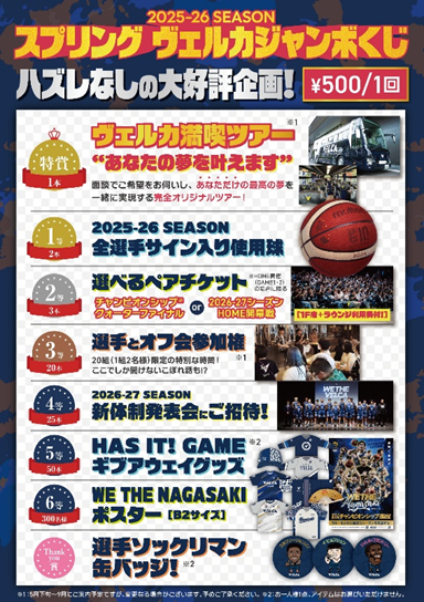 長崎ヴェルカでは、大好評企画「スプリング ヴェルカジャンボくじ」を2026年4月22日(水)から販売いたします 。